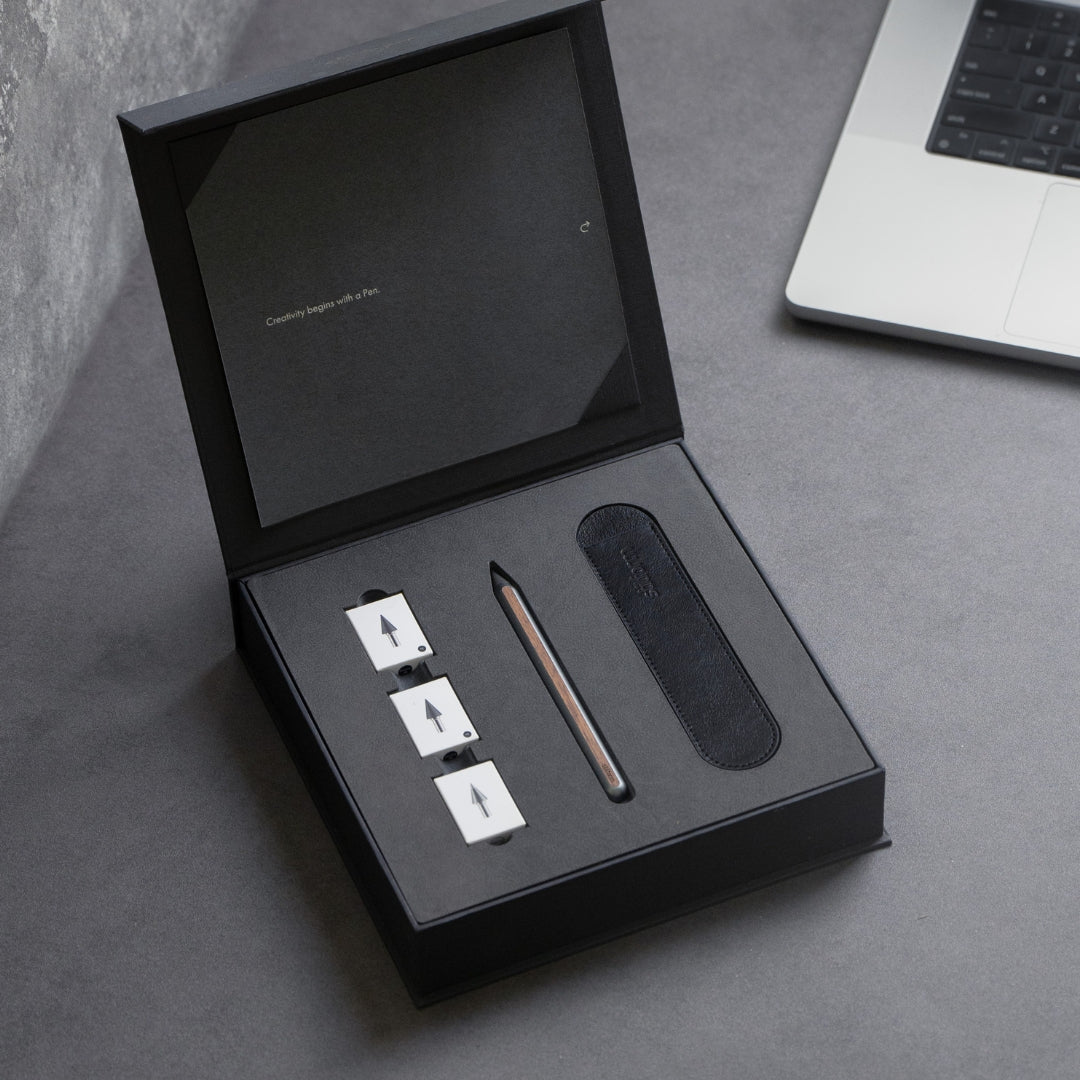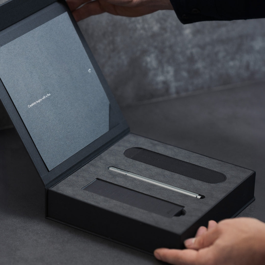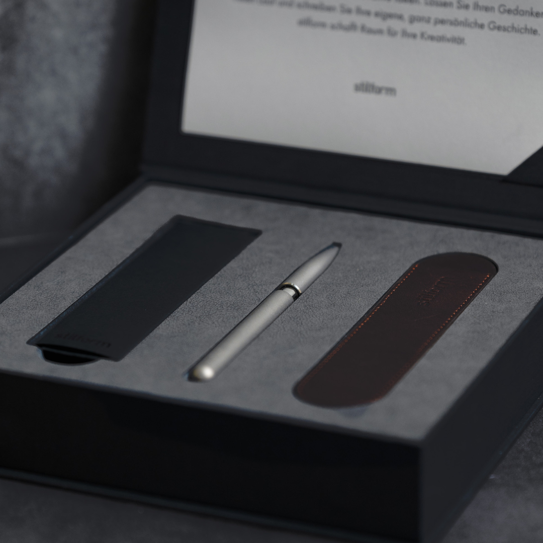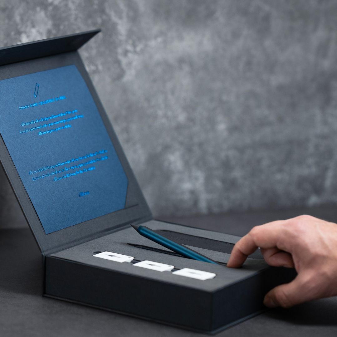 Our gift boxes combine high-quality materials with a refined aesthetic. Each box includes a writing instrument — customizable with engraved logos or text — along with a curated selection of refills and accessories. Featuring a magnetic closure and thoughtful presentation, the sets can be tailored to your needs, making them a distinctive choice for personal or corporate gifting.